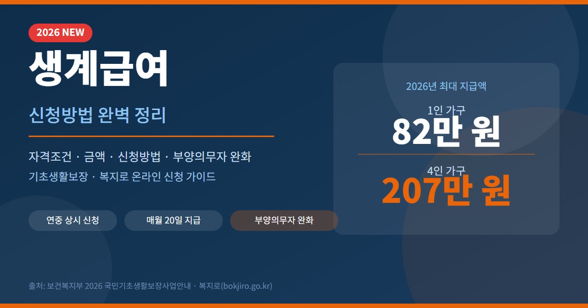 2026년 생계급여는 1인 가구 최대 월 820,556원, 4인 가구 최대 월 2,078,316원을 현금으로 지급합니다. 기준 중위소득의 32% 이하이면 신청 가능하며, 올해부터 부양의무자 기준이 대폭 완화되어 과거 탈락했던 분도 재신청 대상이 될 수 있습니다.