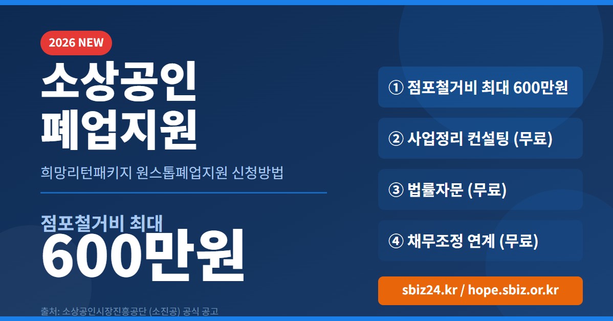 폐업을 결심했다면 혼자 감당할 필요가 없습니다. 2026년 희망리턴패키지 원스톱폐업지원을 통해 점포 철거비 최대 600만원을 비롯해 컨설팅·법률자문·채무조정까지 무료로 지원받을 수 있습니다.